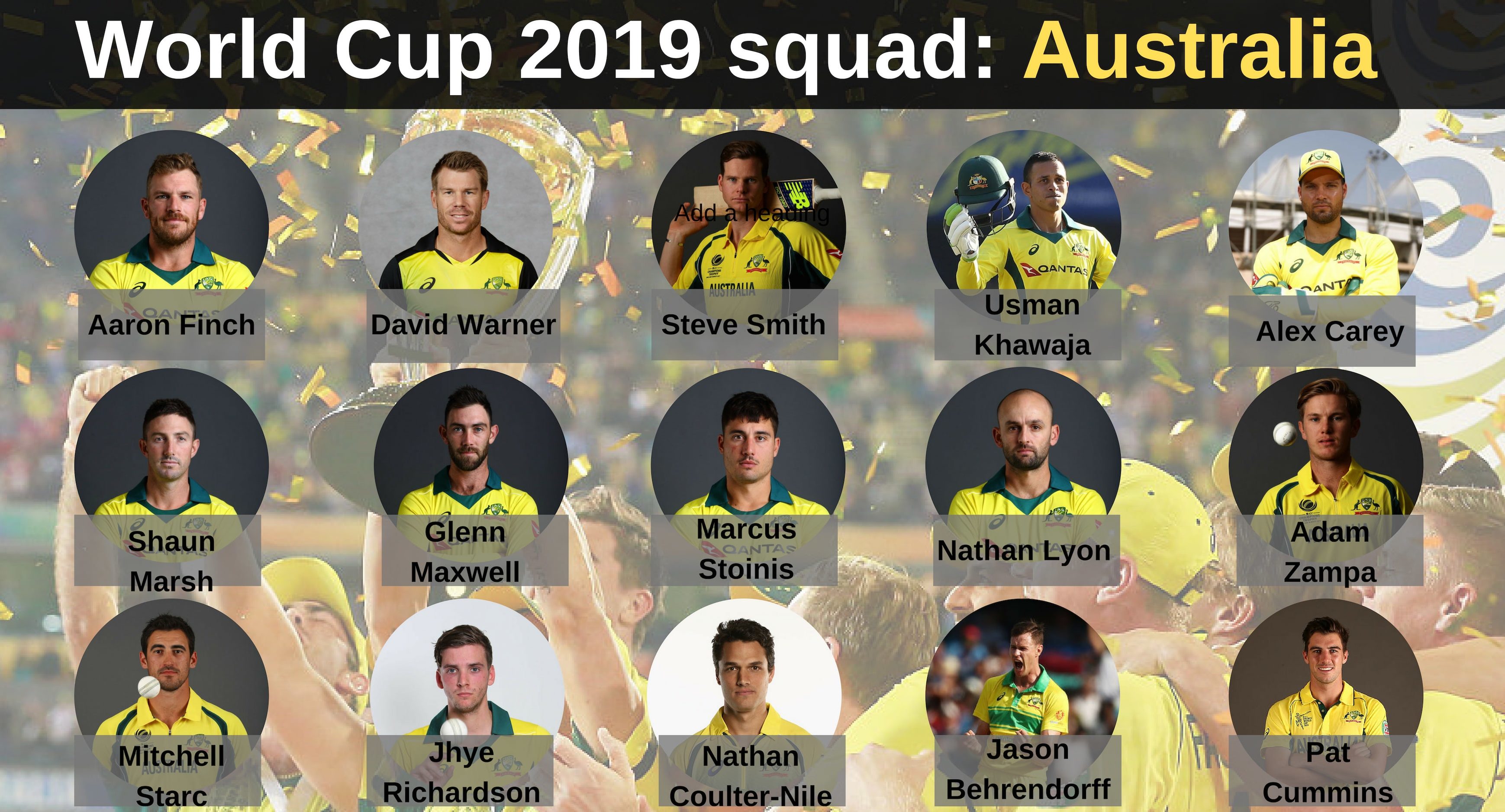 سابق کپتان اسٹیواسمتھ اورڈیوڈ وارنراس اسکواڈ کا حصہ ہوں گے.آسڑیلوی اسکواڈ میں کپتان ایون فنچ ، عثمان خواجہ، ڈیوڈ وارنر، اسٹیو اسمتھ، شان مارش، گلین میکسوئل، مارکوس اسٹوئنس، الیکس کیرے، پیٹ کومنز، مچل اسٹارک، جھے رچرڈسن، نیتھن کولٹرنائیل، جیسن بہرینڈورف، نیتھن لیون اورایڈمزامپا شامل ہیں۔