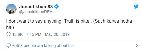 سوشل میڈیا پرجاری تصویر میں جنید خان نےاپنےمنہ کوٹیپ لگا کربند کررکھا ہےاور ٹویٹ میں لکھا ہے میں کچھ نہیں کہنا چاہتا،کیونکہ سچ کڑوا ہوتا ہے۔