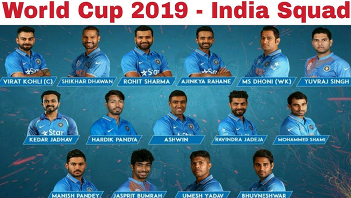 بھارتی اسکواڈ میں کپتان ویرات کوہلی روہیت شرما، شیکھر دھون، لوکیش راہول، وجے شنکر، مہندار سنگھ دھونی، کیدر جادھو، دنیش کارتک، یوزویندر چاہل، کلدیپ یادیو، بھونیشور کمار، جسپریت بومرہ، ہاردک پانڈیا، رویندرا جدیجا اور محمد شامی شامل ہیں۔کرکٹ ورلڈ کپ 30مئی سے 14جولائی تک انگلینڈ میں کھیلا جائے گا۔