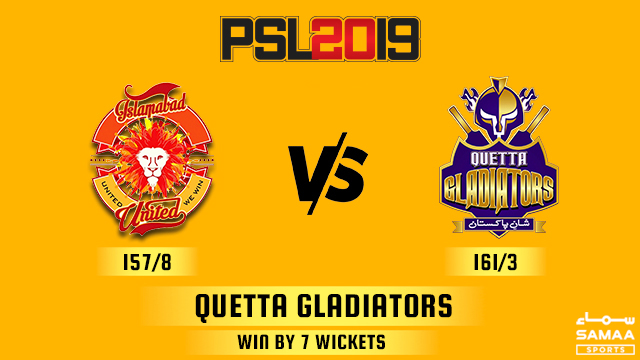 کامیابی حاصل کی۔عمر اکمل نے مین آف دی میچ کا ایوارڈ حاصل کیا۔اسلام آباد یونائیٹیڈ نے کوئٹہ گلیڈی ایٹرز کی ٹیم کو 158 رنز کا ہدف دیا۔ ہدف کے تعاقب میں کوئٹہ کے بیٹسمین احمد شہزاد 2 رنز پر آؤٹ ہوگئے۔ روسوو نے بھی صرف 10 رنز اسکور کئے۔ عمر اکمل نے 28 گیندوں پر 44 رنز کی بہترین اننگ کھیلی۔انہوں نے 5 چوکے اور 2 چھکے لگائے۔