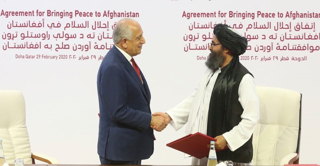 قطر کے دارالحکومت دوحہ میں ہونے والی تقریب میں افغان طالبان کی جانب سے سینئر رہنماءملا عبدالغنی برادر اور امریکاکی جانب سے نمائندہ خصوصی برائے افغان مفاہمتی عمل زلمے خلیل زاد نے معاہدے پر دستخط کیے، طالبان کا وفد روایتی لباس شلوار قمیص میں ملبوس ہوکر اپنے پرچم لیے معاہدے کی دستخط کی تقریب میں شرکت کے لیے پہنچا اور دعا کی۔