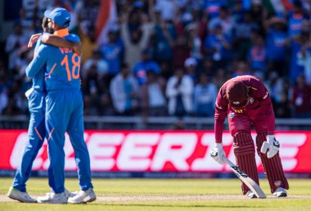 مقررہ پچاس اوورز میں ویرات کوہلی اور مہندر سنگھ دھونی کی نصف سنچریوں کی بدولت بھارت نے 269 رنز بنائے تو ایسا لگ رہا تھا کہ ویسٹ انڈیز یہ ہدف حاصل کرکے ٹورنامنٹ میں اپنی دوسری فتح کا منہ دیکھے گا۔ لیکن انڈین بولنگ اٹیک کے سامنے ویسٹ انڈین بیٹنگ لائن ریت کی دیوار ثابت ہوئی اور پوری ٹیم 34 اعشاریہ 2 اوورز میں 143 رنز پر ڈھیرہوگئی۔محمد شامی ایک بار پھرانڈیا کے سب سے کامیاب بولر رہے۔ انہوں نے صرف 6 اوورز میں 16 رنز دے کر 4 وکٹیں حاصل کیں۔