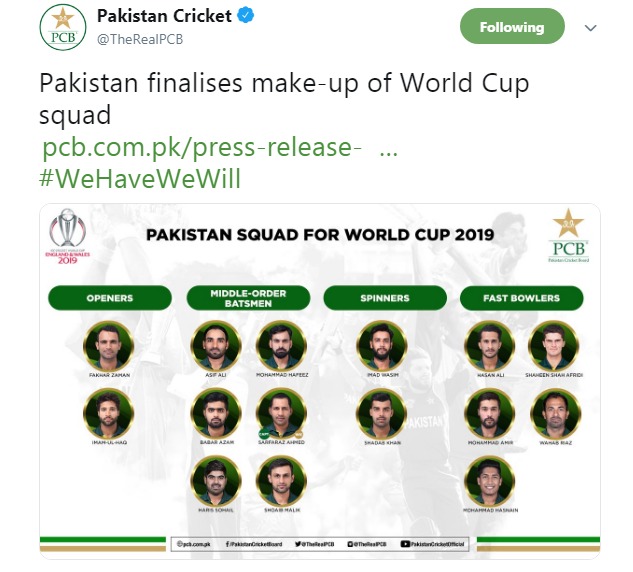 پاکستانی ٹیم کا اعلان کردیا گیا۔ پاکستان کرکٹ بورڈ کے چیف سلیکٹر انضمام الحق نےلاہور میں پریس کانفرنس کرتے ہوئے ورلڈکپ کیلئے حتمی پاکستان اسکواڈ کا اعلان کیا ۔ سلیکشن کمیٹی نے ورلڈ کپ کے لیے اسکواڈ میں تین تبدیلیاں کرتے ہوئے فہیم اشرف، جنید خان اور عابد علی کو ڈراپ کر کے ان کی جگہ محمد عامر، وہاب ریاض اور آصف علی کو شامل کرلیا ہے۔