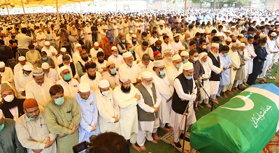 کردیا گیا ۔قبل ازیں ان کی نماز جنازہ عید گاہ گراو¿نڈ ناظم آباد میں ادا کی گئی۔نماز جنازہ امیر جماعت اسلامی پاکستان سینیٹر سراج الحق نے پڑھا ئی، جس میں مختلف سیاسی جماعتوں کے قائدین کے ساتھ جماعت اسلامی کے مرکزی رہنما لیاقت بلوچ ،امیر جماعت اسلامی کراچی حافظ نعیم الرحمن ،تمام اضلاع کے امیر ،جماعت اسلامی کے اراکین ،کارکنوں اورشہریوں نے بڑی تعداد میں شرکت کی۔بعد ازاں انہیں آہوں وسسکیوں کے ساتھ سخی حسن قبر ستان میں سپر دخاک کردیا گیا ۔