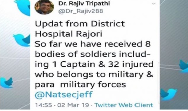 راجوڑی اسپتال کے سربراہ ڈاکٹر راجیو تریپاٹھی نے اپنے ٹوئٹر اکاؤنٹ پر جاری پیغام میں انکشاف کیا ہے کہ 8 لاشیں اور 32 زخمی اسپتال لائے گئے ہیں، مرنے والوں میں ایک کیپٹن بھی شامل ہے جبکہ دیگر افراد فوج اور پیرا ملٹری فورس سے تعلق رکھتے ہیں۔
